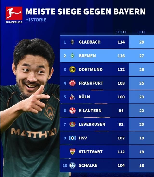 德甲各队历史胜拜仁次数榜:门兴28场第一,今晚交手的不莱梅第二